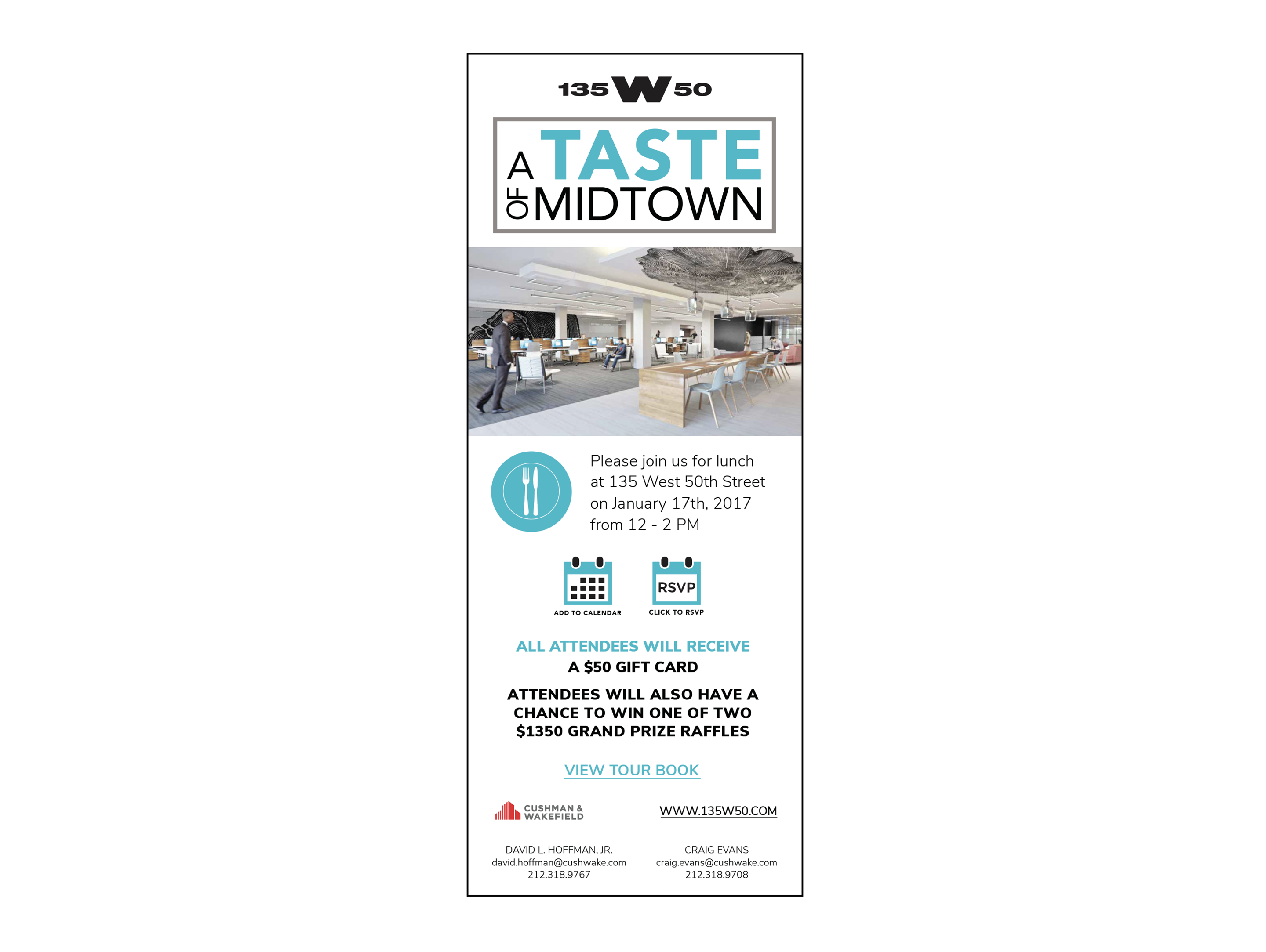Situated at the epicenter of NYC, 135 West 50th Street has cultivated the ultimate environment for thought leaders with an elite roster of corporate tenants. Accessible from two lobbies on 50th and 51st Streets, the building features a rotating display of curated art exhibits. MTG developed a strategic marketing campaign to rebrand and reposition 135 West 50th Street with the goal of raising awareness and attracting top talent. MTG designed an information-rich mixed media environment consisting of colorful boards and vinyl graphics to assist brokers in seamlessly navigating prospects through the space while conveying details of the leasing opportunity. A major component to the campaign was the planning and execution of “A Taste of Midtown,” lunch event featuring select food stations from local vendors. In addition to a website, e-vites, and renderings, MTG designed graphic way-finding boards directing attendees through the building to the event space and new prebuilt suites.